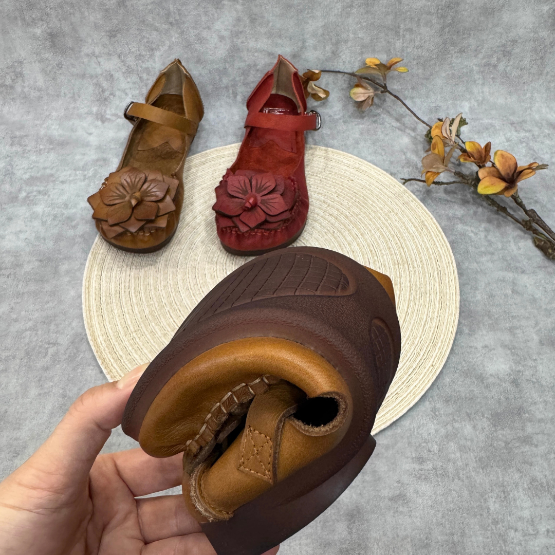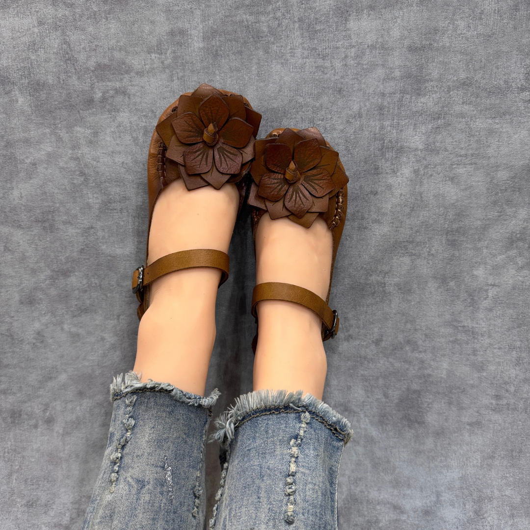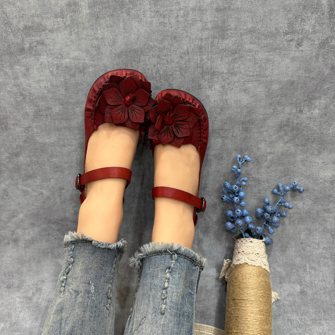 Mengusung desain etnik-vintage yang elegan, sandal ini dihiasi dengan aksen bunga 3D yang dibuat secara manual (handcrafted).